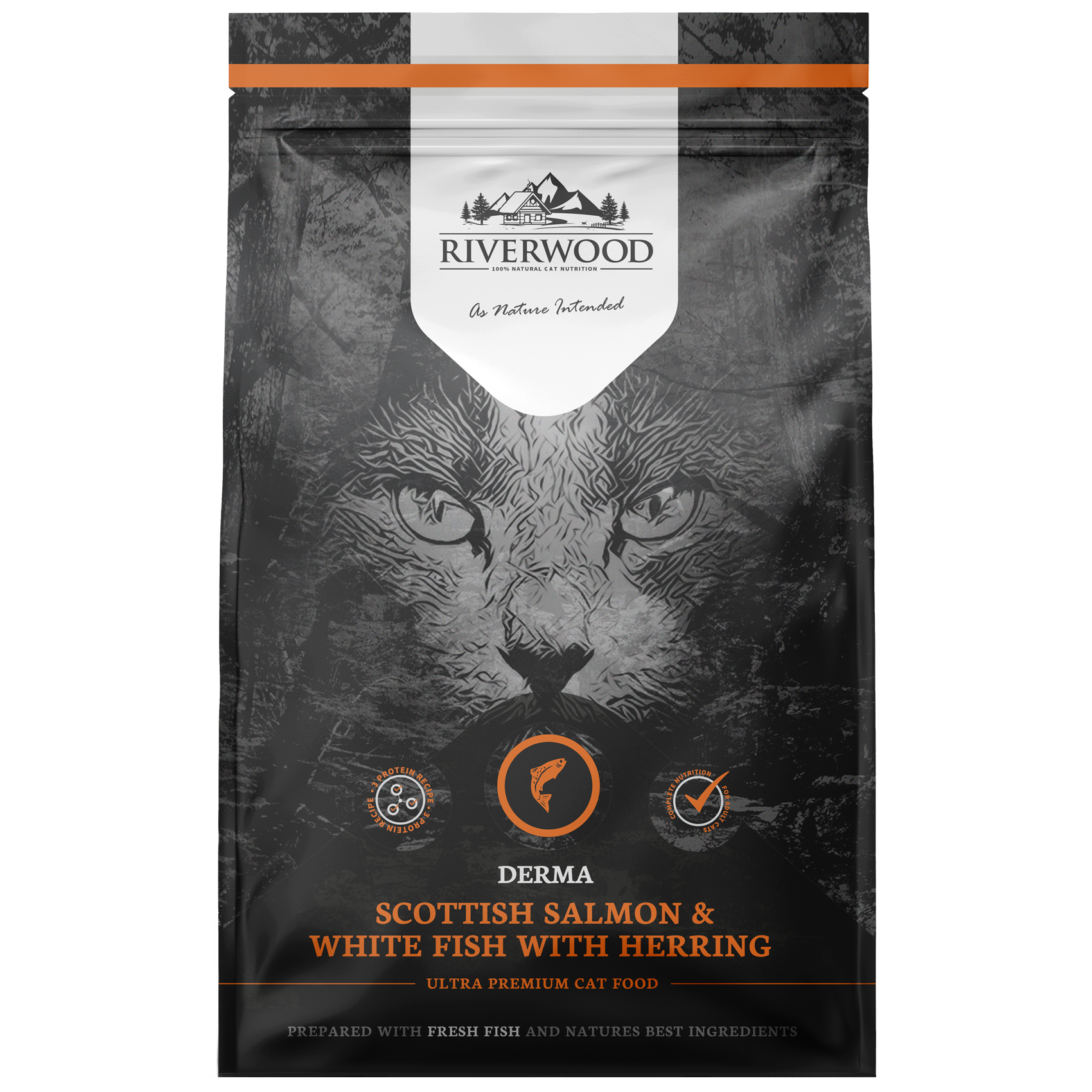 Riverwood Cat Derma is a fish-based, grain-free complete food designed especially for skin and coat health. The high level of Omega-3 fatty acids (EPA & DHA) supports coat shine, skin moisture balance, and the natural protective barrier — particularly recommended for medium- and long-haired cats.