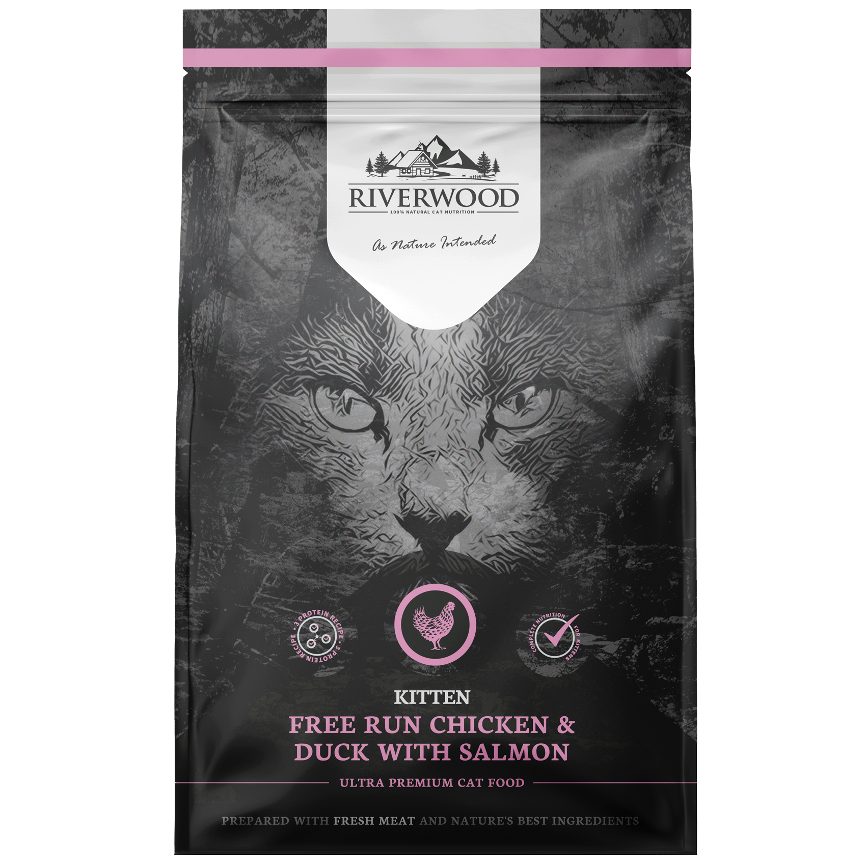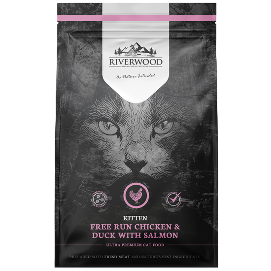 Riverwood Cat Kitten – Chicken & Duck with Salmon on täysravinto kissanpennuille (1–12 kk). Resepti sisältää 65 % korkealaatuista eläinvalkuaista kanan, ankan ja lohen yhdistelmästä, jotka tukevat kasvavan pennun lihasten, aivojen ja hermoston kehitystä.